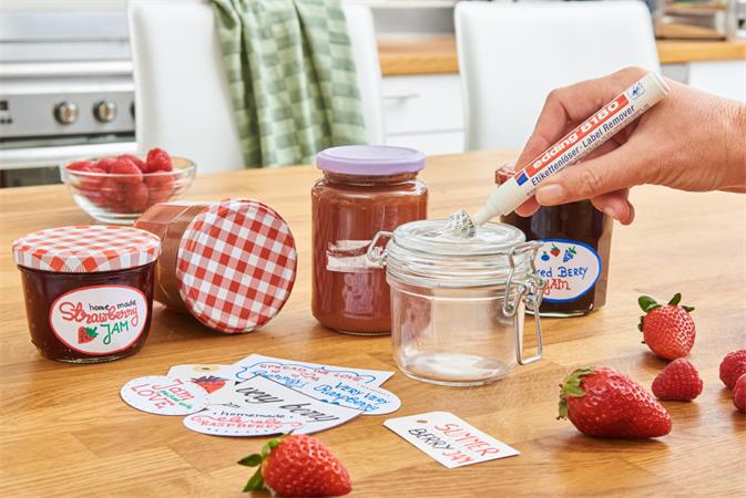 -Hagyja néhány percig hatni, majd egyszerűen távolítsa el a címkét és a ragasztómaradványokat.