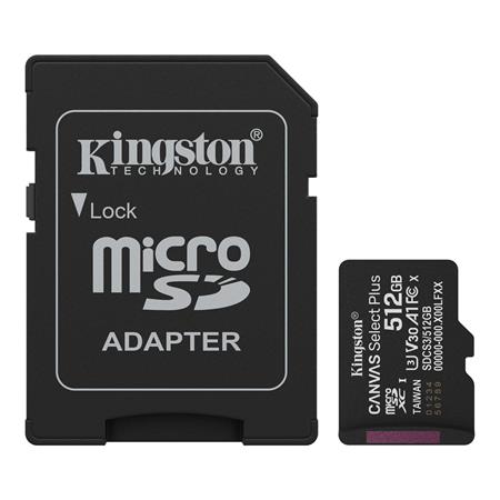 Memóriakártya, microSDXC, 512GB, C10/UHS-I/U3/V30/A1, Gen3, adapter, KINGSTON "Canvas Select Plus"
