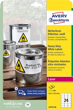 Etikett, 63,5x33,9 mm, poliészter, időjárásálló, AVERY ZWECKFORM, fehér, 480 etikett/csomag