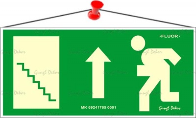 Információs tábla, 25x11,5 cm, fluoreszkáló, utánvilágítós, "Menekülési irány fel, lépcső balra"